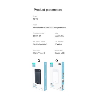 Spesifikasi: - Brand: TOTU - Product: TOTU Minimal Series 10000mAh - Color: Black and White - Battery Capacity: 10000mAh - Total Output: 5V 2.4A Max - Output Type: Double USB - Input Type: Micro & Type-C Port (untuk pengecasan powerbank)