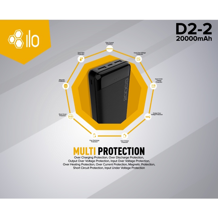 Dual Output & Input Mengisi daya dua perangkat sekaligus dengan powerbank ILO D2 20000mAh yang memiliki dual output sekaligus. Pengisian daya powerbank ini juga sangat mudah dengan port input untuk kabel Micro dan Type-C. Smart Detect Charging Pengisian 4x lebih cepat dengan fitur Smart Detect Charging yang dimiliki oleh powerbank ILO D2 20000mAh. Fitur ini juga dapat menyesuaikan arus keluar sesuai yang dibutuhkan perangkat. Multi Protection Lebih aman menggunakan ILO D2 20000mAh yang memiliki fitur multi protection yang akan melindungi gandget Anda dari berbagai macam bahaya. Flight Friendly Bawa ILO D2 20000mAh ke mana pun Anda pergi karena powerbank ini sudah Flight Friendly.