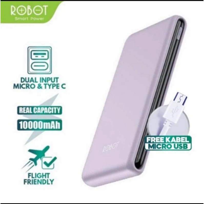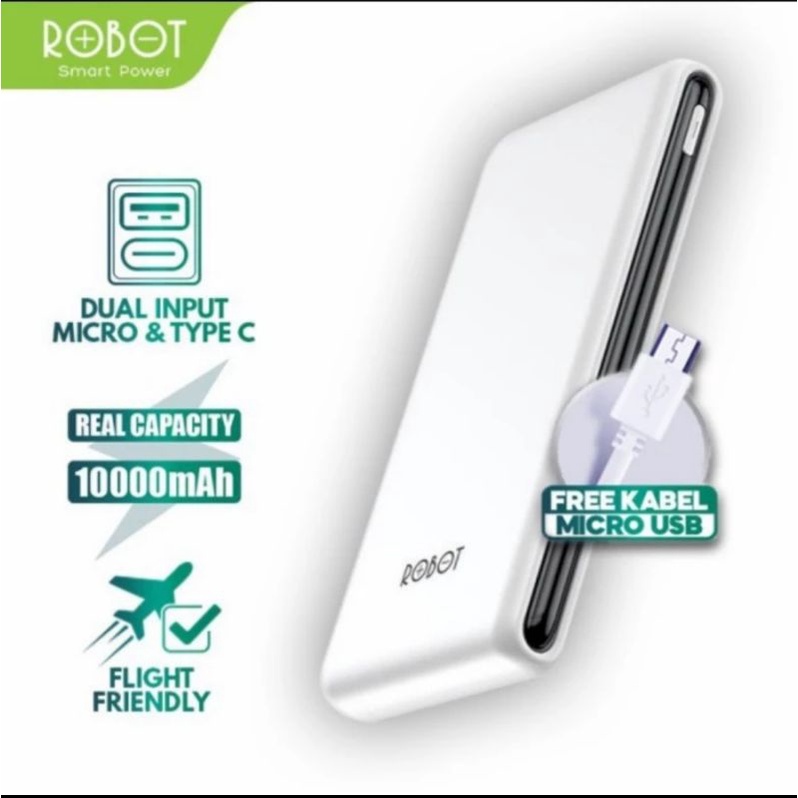 Isi paket : 1 x Power Bank ROBOT RT180 10.000mAh 1 x Charging Kabel Micro 1 x Kartu Garansi