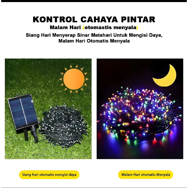 • Sumber Power : Sinar matahari • Jumlah Lampu : 100 Lampu LED • Panjang Kabel : ±5 mete & 10eter • Mode Cahaya : 8 Mode • Warna Lampu : Sesuai varian • Ketahanan Air : IP55