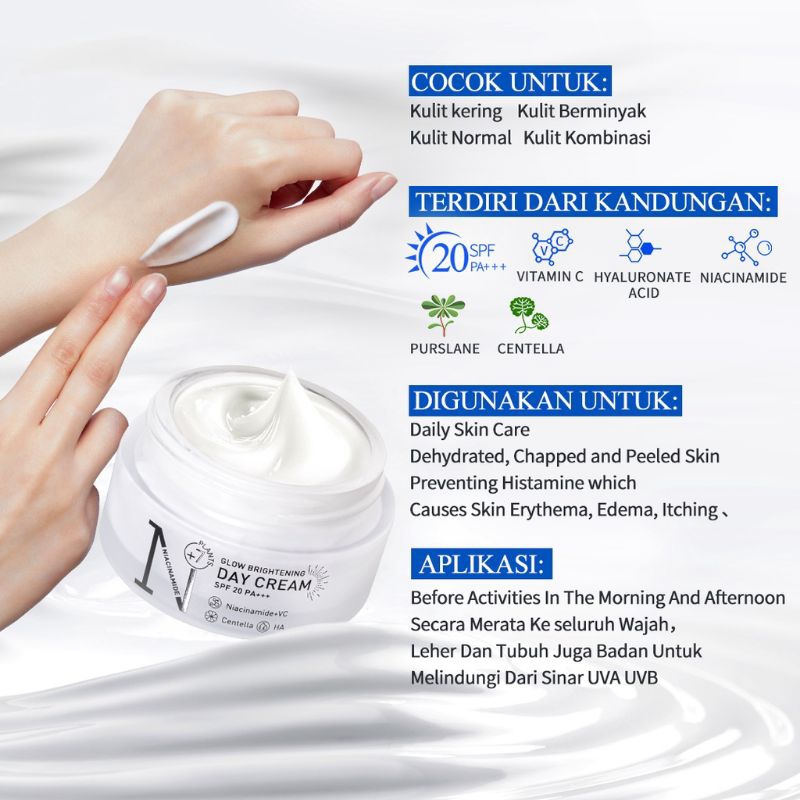 Luminous White Glow Brightening Day Cream Penggunaan day cream secara rutin juga dapat membantu memperlambat penuaan kulit. Jika tidak dilembabkan dan dihidrasi dengan baik, maka kulit wajah yang kering rentan muncul garis-garis halus dan kerutan yang merupakan tanda-tanda penuaan kulit.