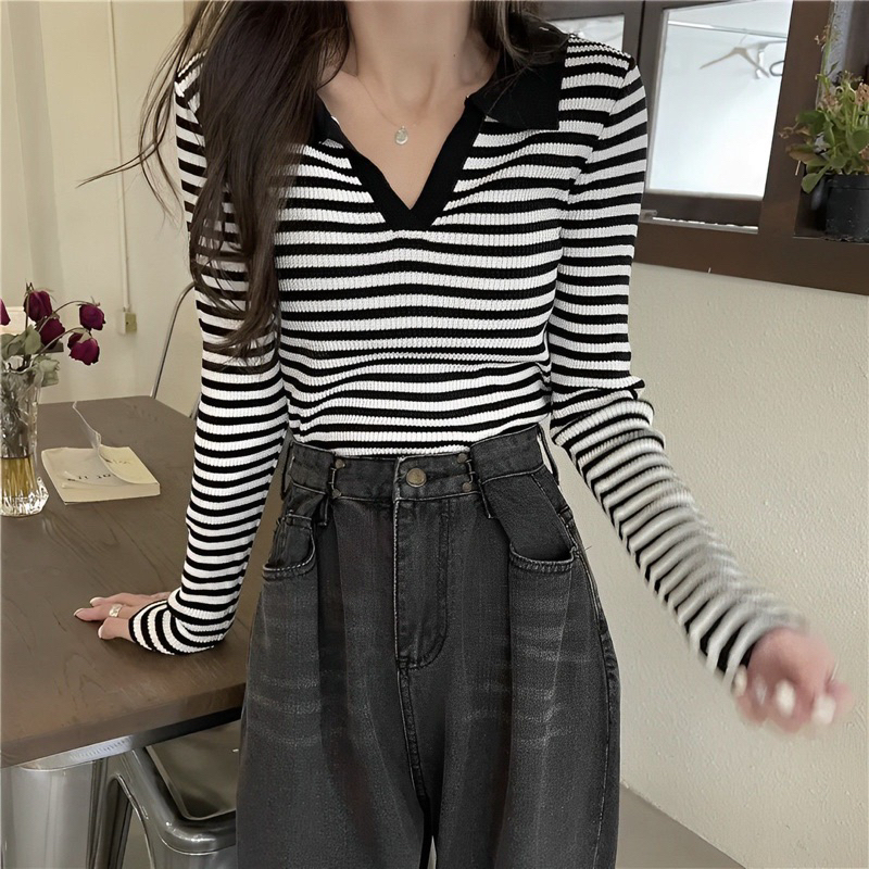 PREMIUM-Atasan Kerah salur polo Rajut Wanita / Korean Vneck Blouse
