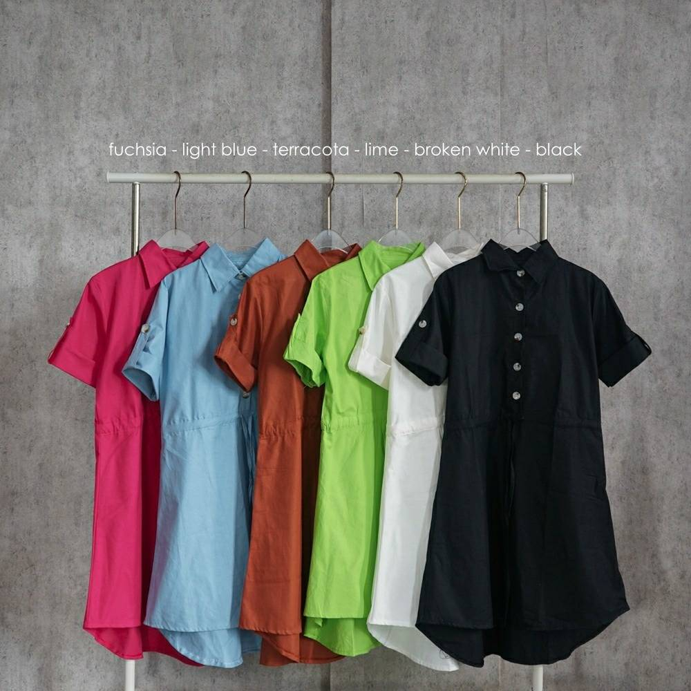 Premium Kemikho Button Dress IDR 88,000 Available in Fuchsia, Light Blue, Terracota, Lime, Broken White and Black Material Premium Cotton LD : 98cm LP : 94cm Length : 87cm (front) 94cm (back) *warna sesuai foto gantung *kancing hidup *tali bagian pinggang menyatu *grosir minimal 6pcs warna bisa dicampur disc 10,000/pcs