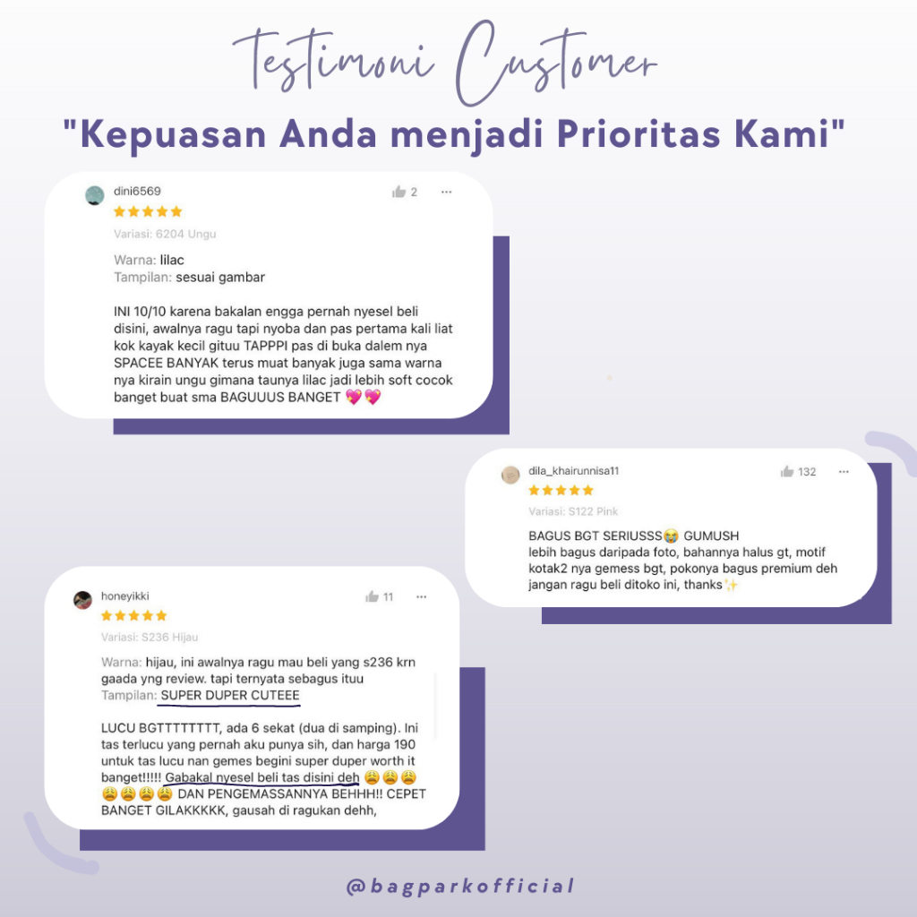 Ready sesuai variasi, langsung diorder aja. • Bahan 100% Import Quality • Bahan Luar : Polyester halus & tebal • Jahitan rapi & double jahit • Bagian dalam furing satin tebaL & ada slot laptop • Laptop sampai dengan 15,6 inch • Bahan berbeda dengan dipasaran (lebih tebal dan lebih berkualitas) jika disandingkan dengan pasaran dijamin LEBIH TEBAL DAN BAHAN TIDAK GARING (TIPIS)