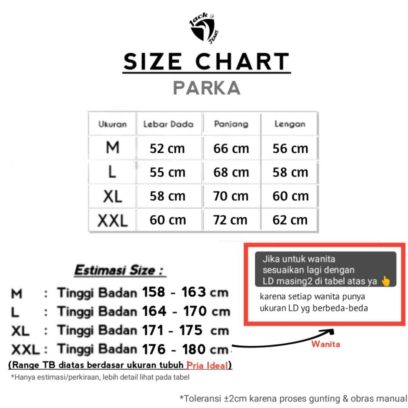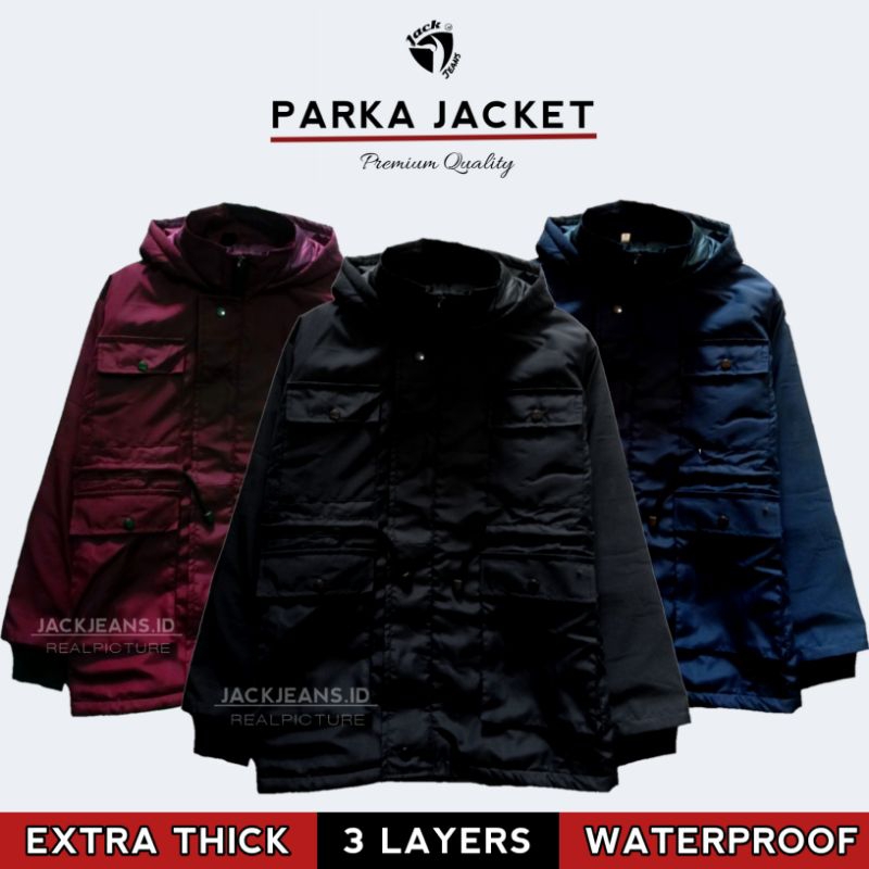 Produk : PARKA JACKET Bahan : Parasut Mayer / Despo + Dakron - apa sih unggulan produk di JACKJEANS.ID ? • Bahan parasut mayer premium, sejuk dipakai di iklim tropis seperti Indonesia. • Ada lapisan dakron di dalam kain, jadi bikin tebal dan empuk banget jika dipakai. • Water Resistant. Gak bikin badan kamu basah kalo lagi musim hujan. Tetap hangat dan kering. • Dan alasan yg paling utama nih, kamu bisa resell (dijual lagi) dengan harga pasaran umumnya 130 - 150 ribuan lhoo. Gapercaya ? Cek aja hehe. - DISCLAIMER : Export Garment, keseragaman karakteristik kain & warna 90% antara satu sama lain (sedikit terang/gelap/doff/glossy, Campur). Warna kain dalam random warna tua/gelap. - Apabila memilih variasi warna acak, maka akan dikirim acak, bisa diluar warna-warna yang tersedia sebagai pilihan variasi. . Jadwal Kemas & Kirim : Pesanan yang masuk sebelum 12.00 WIB akan dikirim di hari yang sama, jika melebihi akan dikirim pada hari kerja berikutnya, (kecuali : Minggu & Tgl merah LIBUR).