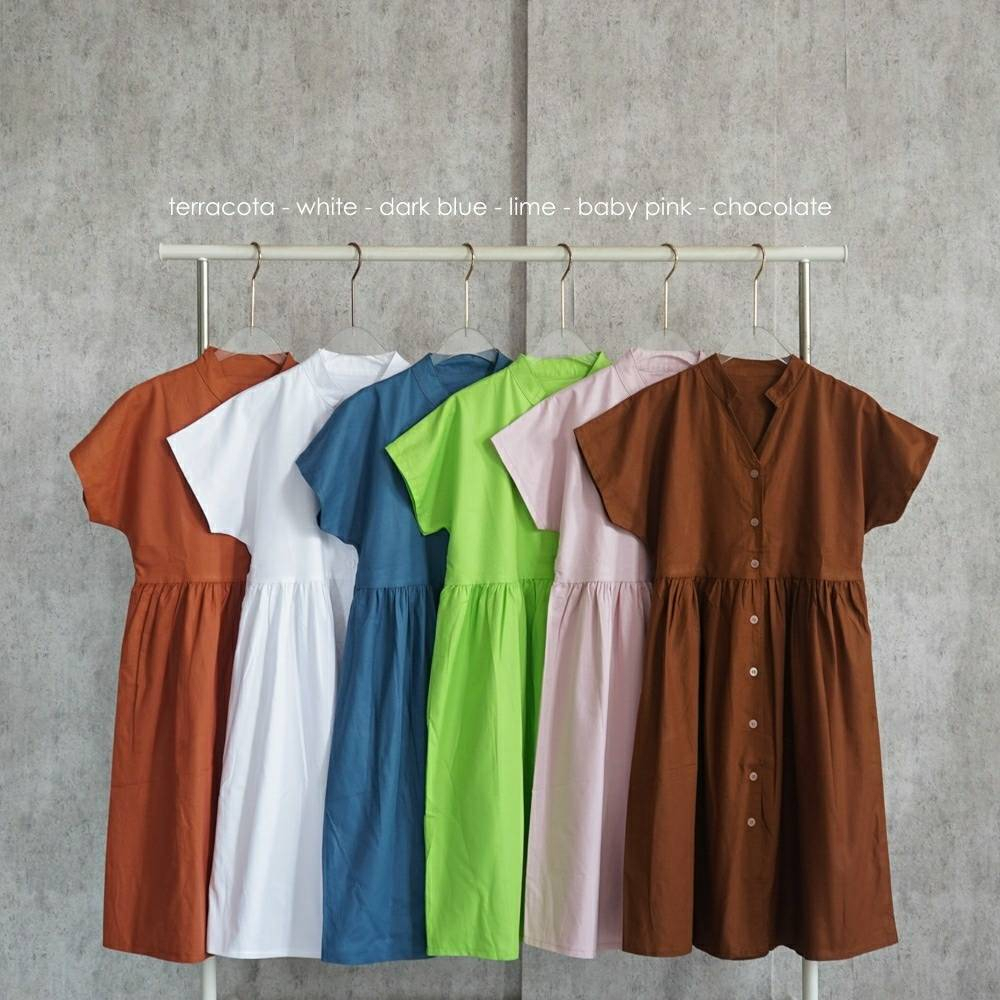 Premium Soren Button Dress IDR 91,000 Available in Terracota, White, Dark Blue, Lime, Baby Pink and Chocolate Material : Premium Cotton LD : 92cm Length : 92cm *warna sesuai foto gantung *kancing hidup *grosir minimal 6pcs warna bisa dicampur disc 10,000/pcs