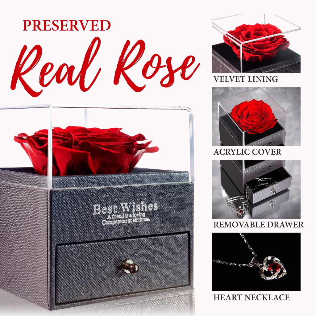 🌹【Romantic Gifts for Special Her】- Preserved red rose flower is a symbol of eternal true love, appreciation and caring. It's perfect holiday gifts for your mom, girlfriend, wife, grandma, Fiancée, best friend, sisters and your beloved ones in Valentine's Day, Mother's day, Wedding, graduation, anniversary, propose marriage, party. Gifts include: 1*real rose gift box, 1*necklace, 1* pair of earrings, 1*greeting card, 1*gift bag.
