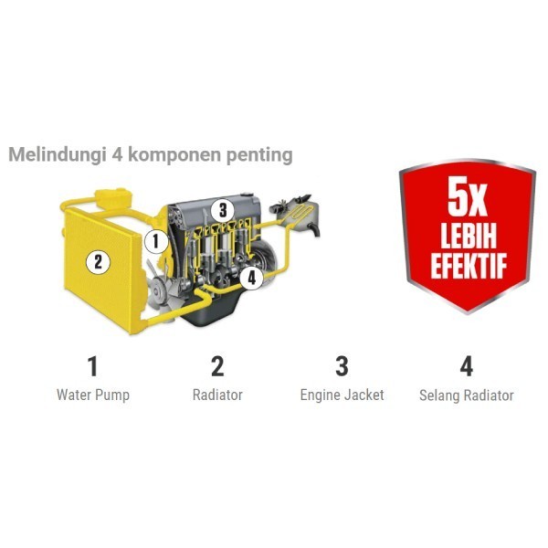 Garansi 10 Tahun / 480.000 KM Anti buih. Meningkatkan titik didih hingga lebih 126º C. Mengandung aditif khusus yang berfungsi untuk melindungi bagian-bagian metal pada sistem pendingin mesin agar tidak berkarat. Mencegah panas berlebih (over heating) Sesuai dengan gaya hidup masa kini yang serba praktis