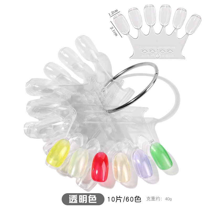 READY STOCK!!! Specifications: For nail practice, display, nail polish and nail art decoration design work. It can be used as practice fan board for freshman. Suitable for professional use or practice at home. Type: Nail Art Tips Quantity: 60Pcs/20pcs Material: Plastic Style: Ring Holder Features: Fan Shape, Manicure Tool, Display Stand Warna: transparan
