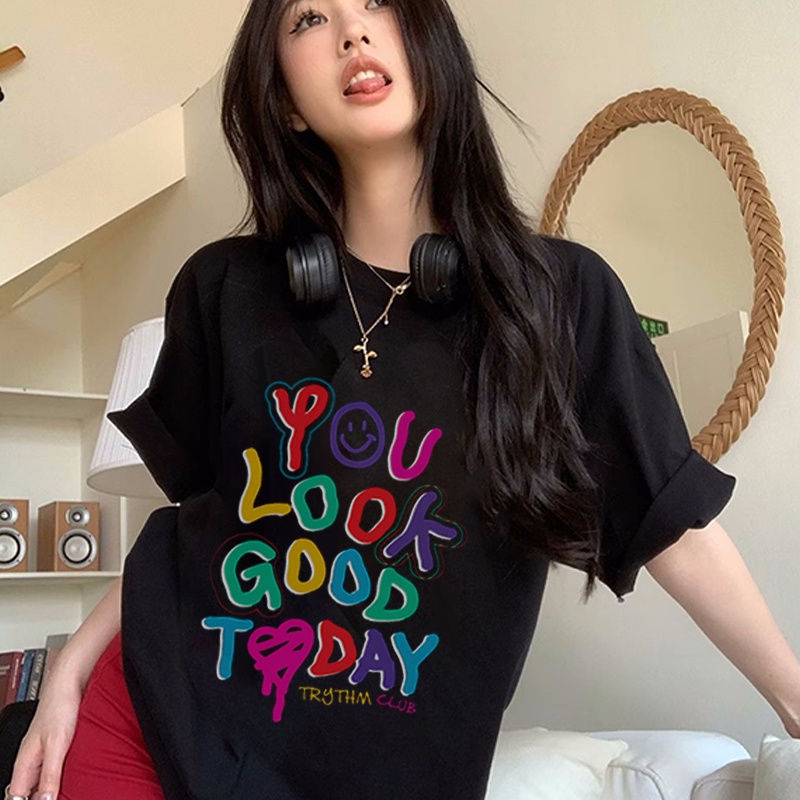 Detail Print T-shirt Kaos Lengan Pendek Design Sense Color English Baju Wanita Oversize Korean Style