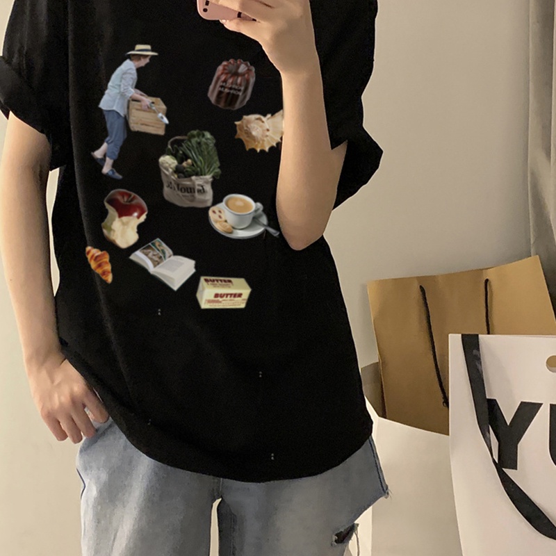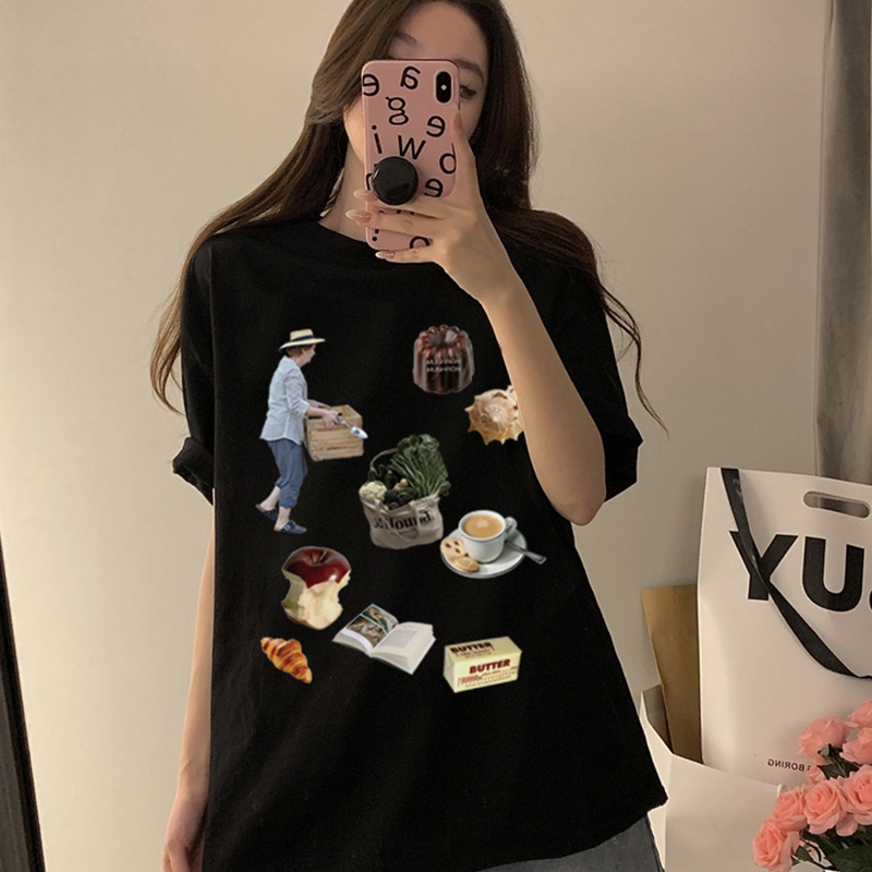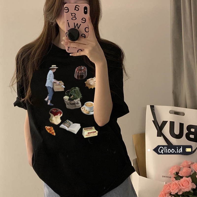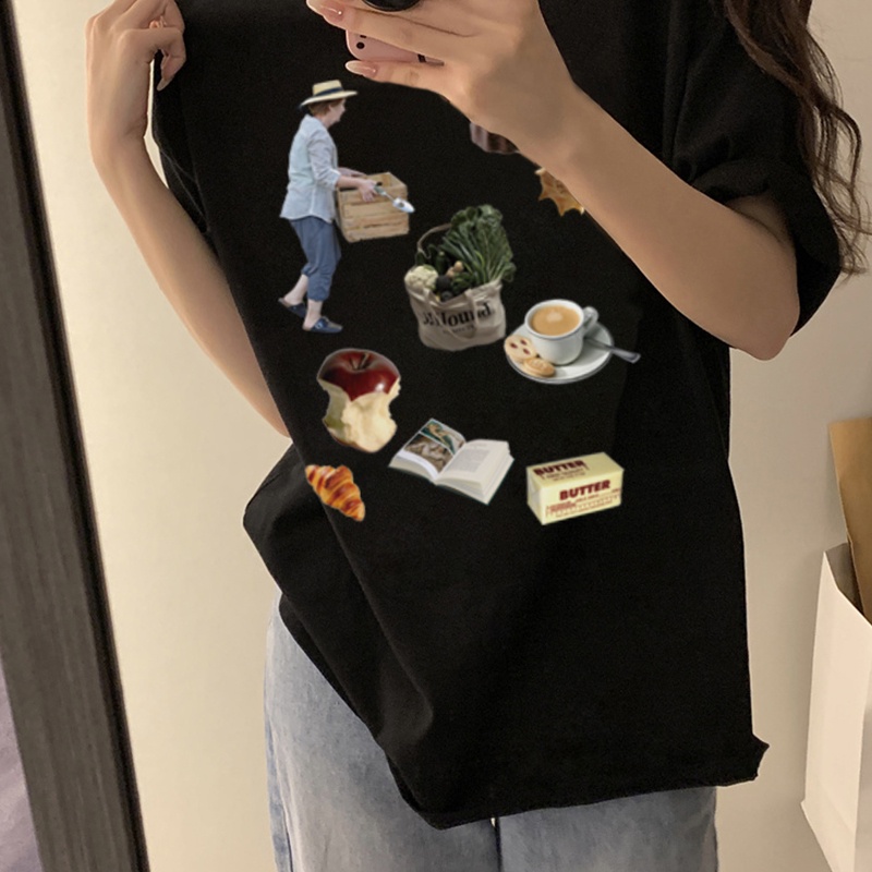Detail Print T-shirt Kaos Lengan Pendek Cartoon Peasant Life Cube Atasan Wanita Korean Style