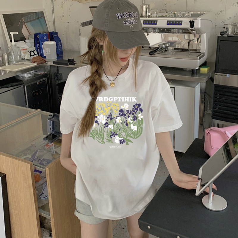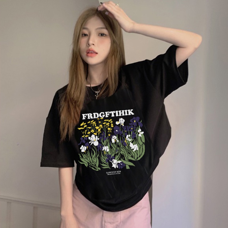 Detail Print T-shirt Kaos Lengan Pendek Cartoon Flowers Baju Wanita Oversize Korean Style