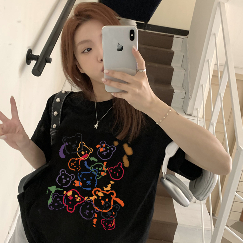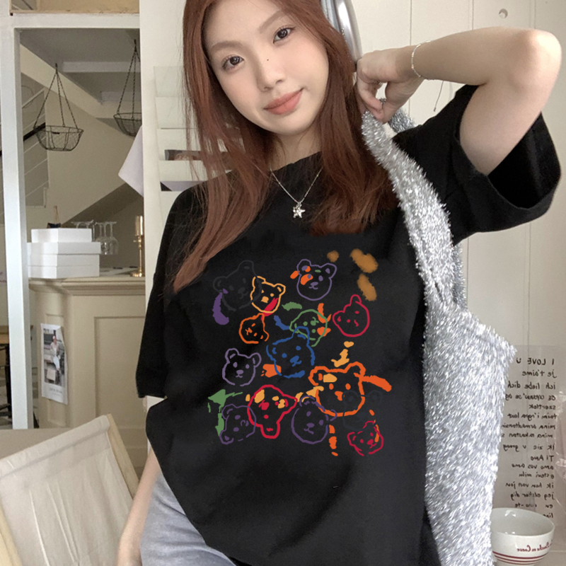 Detail Print T-shirt Kaos Lengan Pendek Colorful Cute Bear Baju Wanita Oversize Korean Style