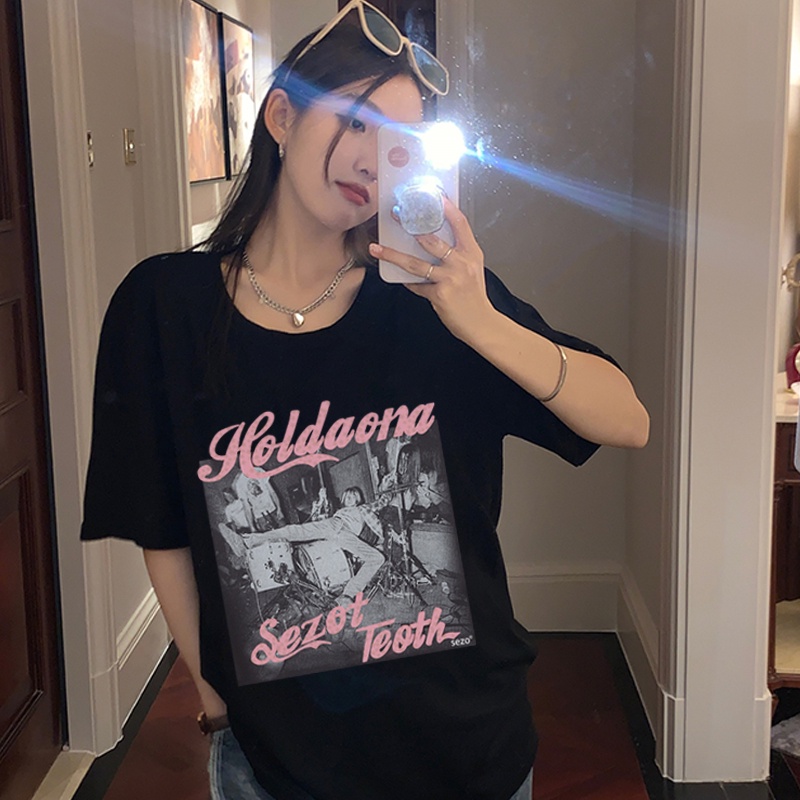 Detail Print T-shirt Kaos Lengan Pendek Vintage Records Baju Wanita Oversize Korean Style