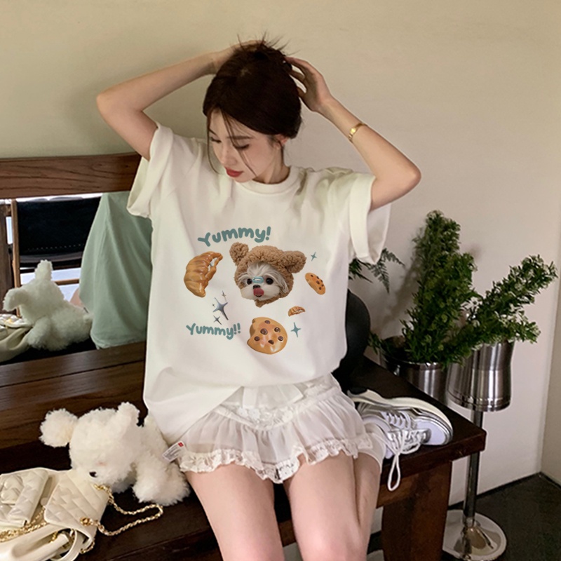 Detail Print T-shirt Kaos Lengan Pendek Cute Cookie Dog Baju Wanita Oversize Korean Style