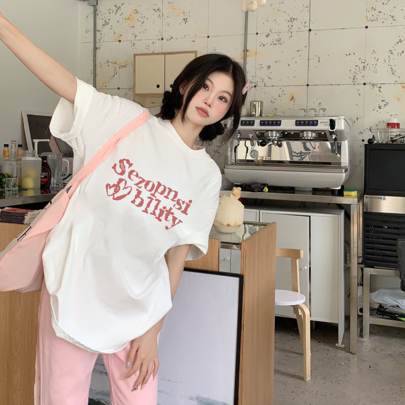 Detail Print T-shirt Kaos Lengan Pendek Cartoon Pink English Baju Wanita Oversize Korean Style