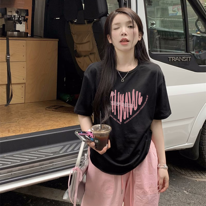 Detail Print T-shirt Kaos Lengan Pendek Pink Heart Electricity Love Oversize Atasan Wanita Korean Style