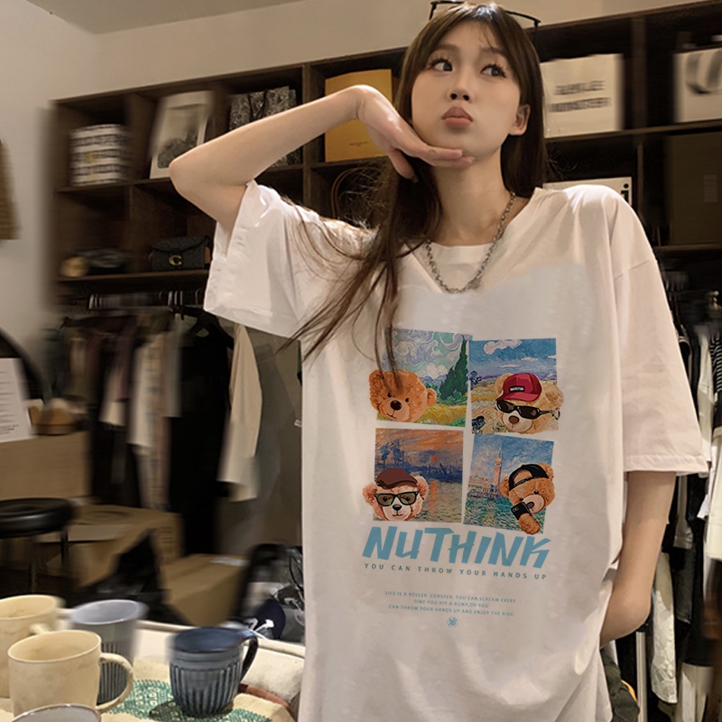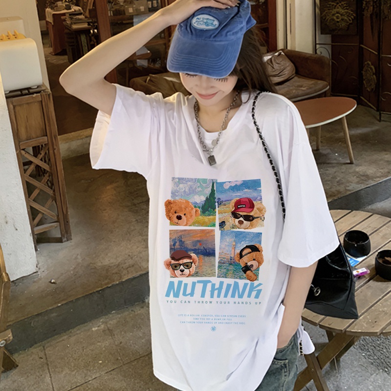 Detail Print T-shirt Kaos Lengan Pendek Travel Bear Baju Wanita Oversize Korean Style