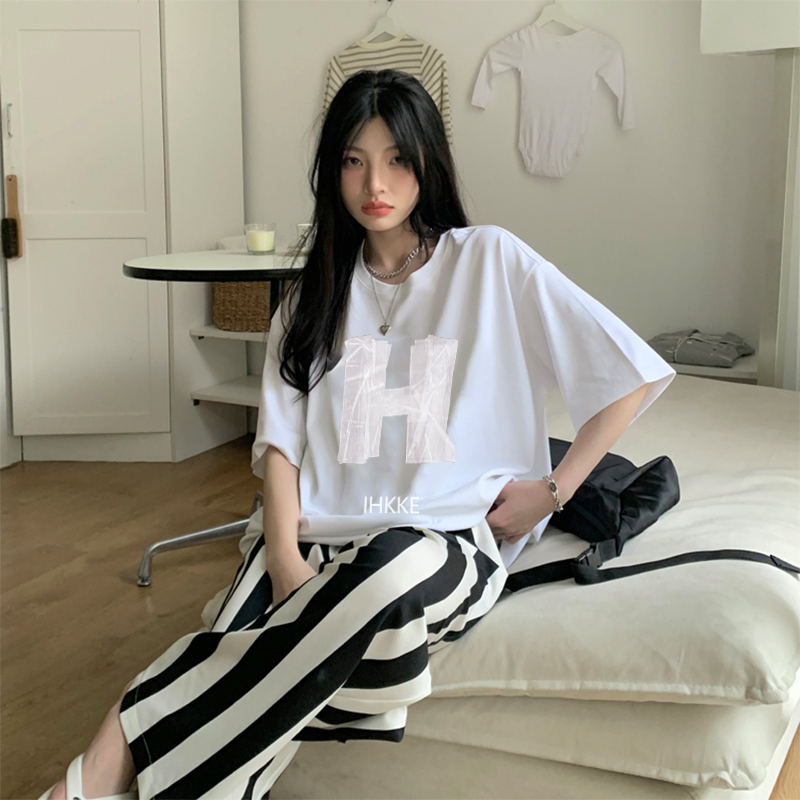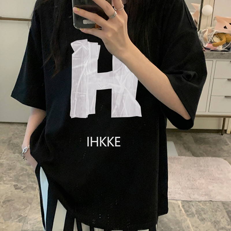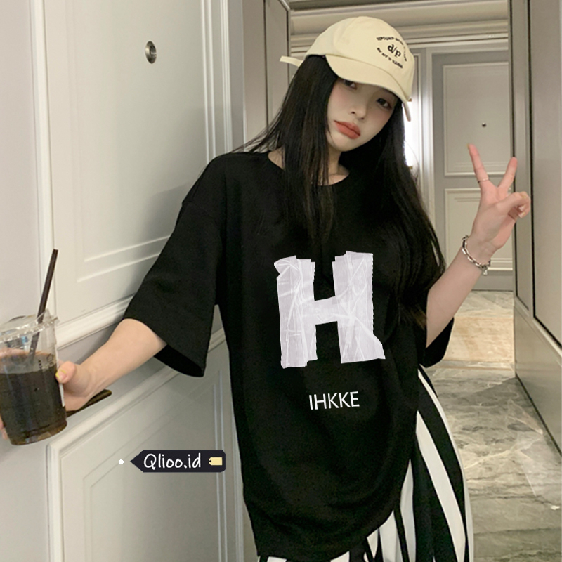 Detail Print T-shirt Kaos Lengan Pendek Design Sense H English Baju Wanita Oversize Korean Style