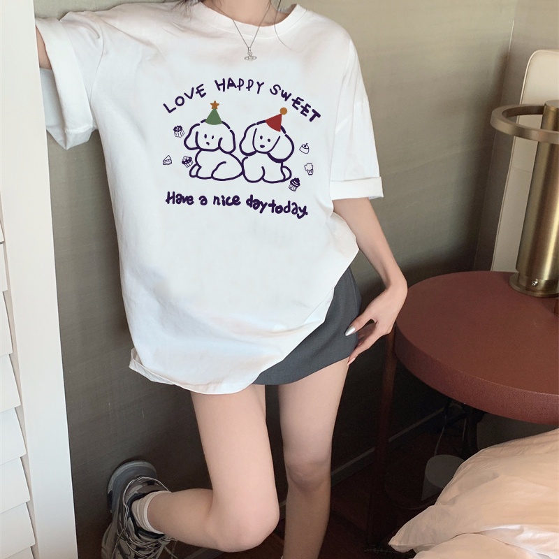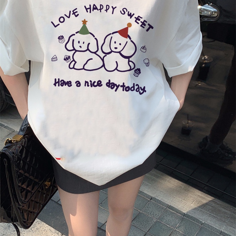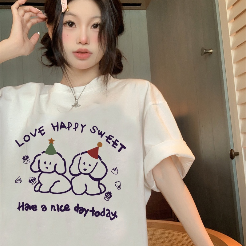 Detail Print T-shirt Kaos Lengan Pendek Cartoon Birthday Dog Baju Wanita Korean Style