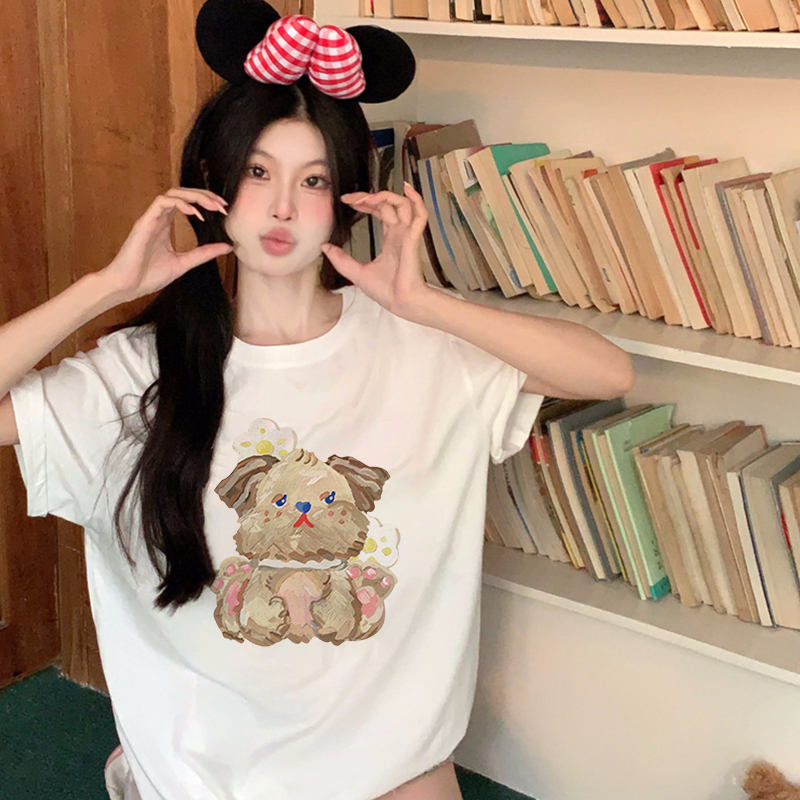 Detail Print T-shirt Kaos Lengan Pendek Cartoon Oil Painting Dog Oversize Atasan Wanita Korean Style