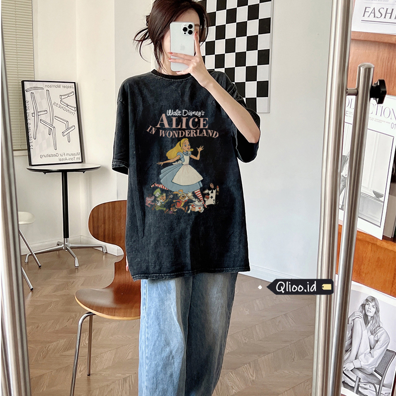 Detail Print Washed T-shirt Kaos Lengan Pendek Oversize Hitam Cartoon Alice In Wonderland Korean Style Atasan Wanita