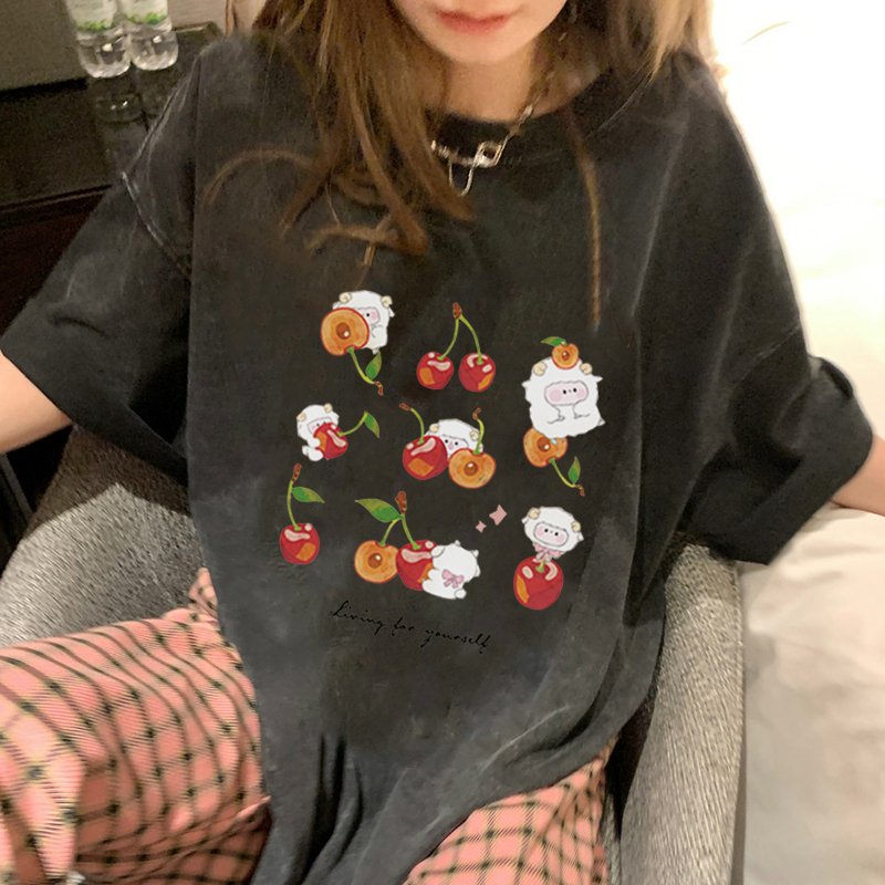 Detail Print Washed T-shirt Kaos Lengan Pendek Oversize Cute Small Cherry Korean Style Atasan Wanita