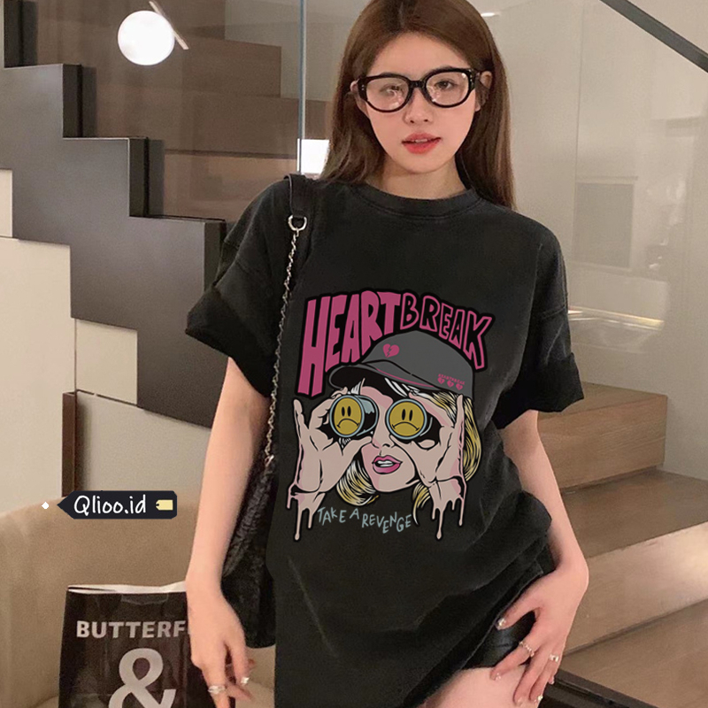 Detail Print Washed T-shirt Kaos Lengan Pendek Oversize Hitam Vintage Pink Heart Break Korean Style Atasan Wanita