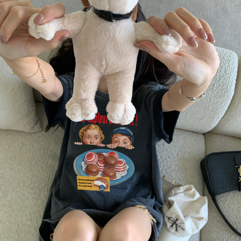Detail Print Washed T-shirt Kaos Lengan Pendek Oversize Cartoon Dessert Korean Style Atasan Wanita
