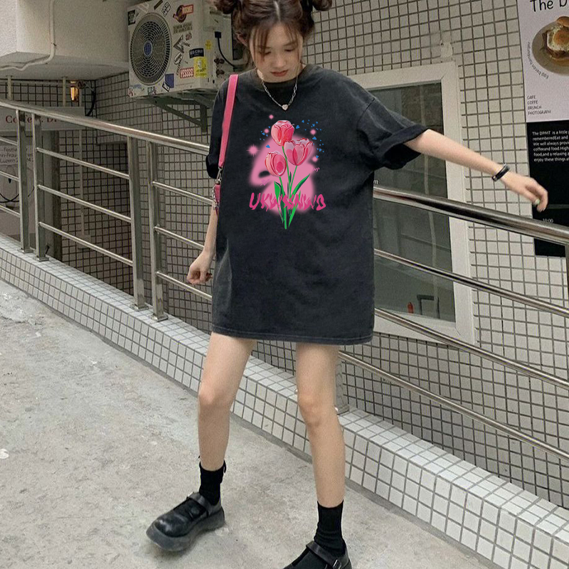 Detail Print Washed T-shirt Kaos Lengan Pendek Oversize Cartoon Pink Flowers Korean Style Atasan Wanita