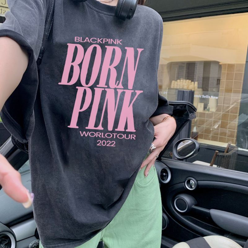 Detail Print Washed T-shirt Kaos Lengan Pendek Oversize Retro BlackPink Korean Style Atasan Wanita