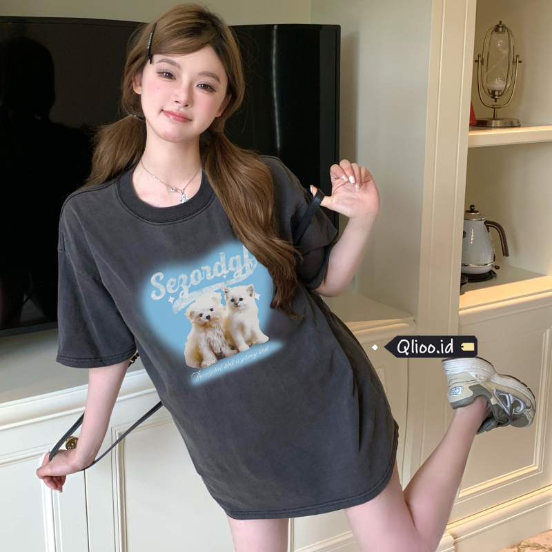 Detail Print Washed T-shirt Kaos Lengan Pendek Oversize Cartoon Blue Cat Korean Style Atasan Wanita