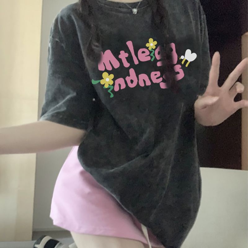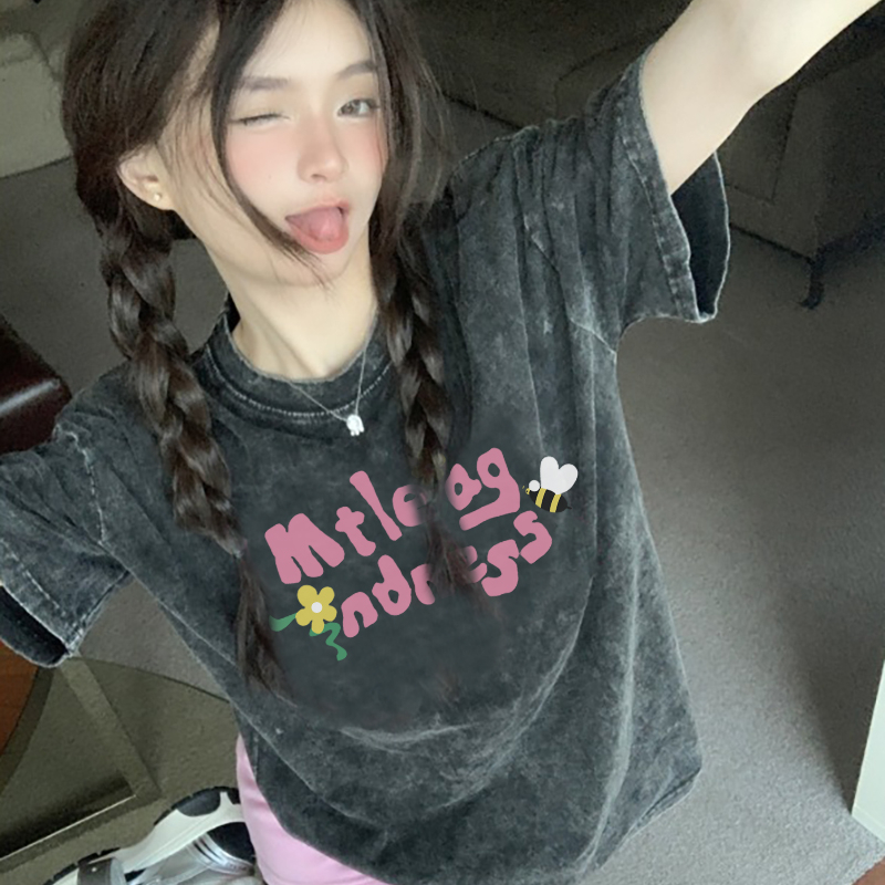 Detail Print Washed T-shirt Kaos Lengan Pendek Oversize Cartoon Pink Bee Korean Style Atasan Wanita