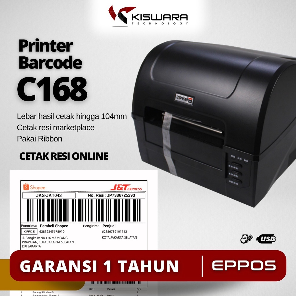EPPOS Printer Barcode C168 merupakan printer barcode dengan teknologi cetak thermal transfer (memakai ribbon) dan direct thermal dengan lebar print area 4″ (104mm). Printer ini dapat menmenuhi kebutuhan printing label barcode yg sesuai dengan budget/dana terbatas. Bentuknya yg ringkas memudahkan dalam pengguaan di lokasi yg sempit. Kualitas, ketahanan,performa dan fungsionalitas nya tetap diutamakan untuk semua keperluan labeling barcode.