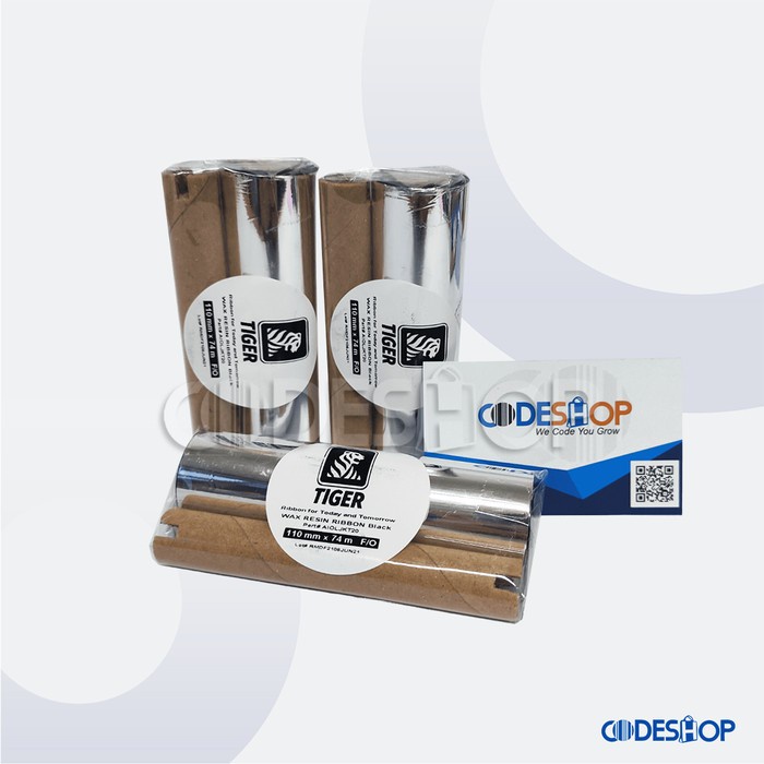 Adapun spesifikasi Ribbon Barcodenya : - Jenis : Wax Resin - Merk : Tiger - Lebar Ribbon : 110 mm - Panjang Ribbon : 74 Meter - Diameter Core Ribbon : 0,5" (12,7 mm) 2 Core dengan Coak - Type Ribbon : Face Out