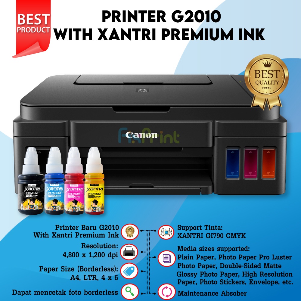 PRINTER CANON PIXMA G2010 NEW WITH COMPATIBLE INK 1. 100% Printer New Original Canon 2. Menggunakan Tinta Premium Ink (compatible ink) 3. Hasil Cetak Tajam 99% Like Original (Dijamin tinta aman utk head printer) 4. Biaya Cetak jauh lebih murah