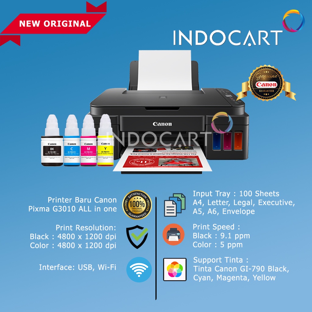 Unit Printer sudah di lengkapi dengan 1 set tinta CMYK tipe Canon G1-790 Printer kondisi baru dan bersegel resmi, bisa di lakukan klaim garansi hanya di service center Canon Jika tinta yang dipakai menggunakan tipe compatible atau non original maka otomatis garansi tidak berlaku