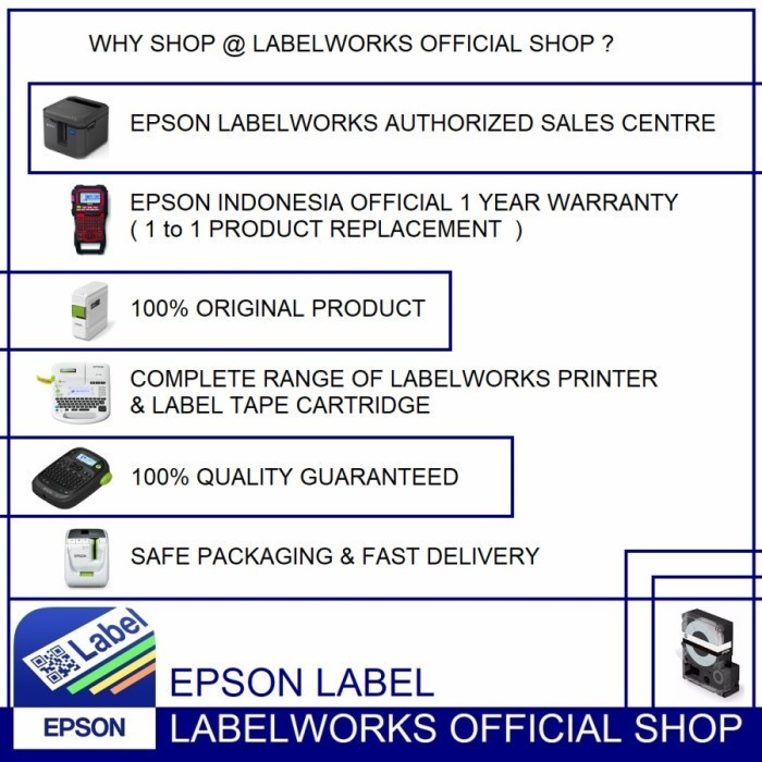 Specification: LK tapes : 6mm, 9mm, 12mm, 18mm 180dpi | 9mm/sec Barcodes and QR Code Durable labels resist water and withstand hot and cold conditions Temperature resistant, waterproof, humidity resistant & scratch resistant tapes Software to downloaded with bluetooth connectivity : - Epson iLabel & Epson Home & Craft Label ( iOS & Android ) - Epson Label editor ( PC ) ( Windows 8, 8.1, 10 ) Automatic Full cutter 6 AA battery ( not included ) 145 x 134 x 54mm | 410gr Epson Indonesia Official 1 year warranty