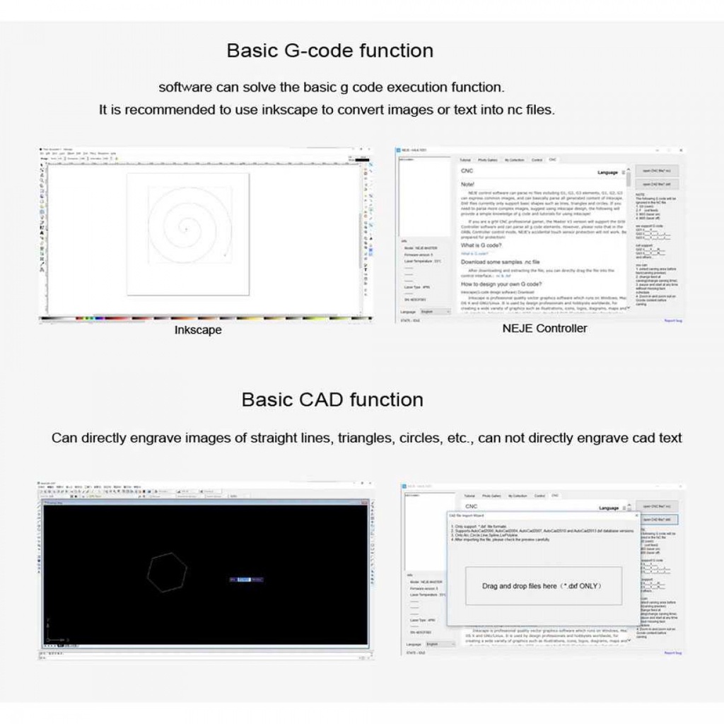 Spesifikasi Format file Scan Format Gambar: .bmp, .jpg, .png, .nc, .dxf, dan lainnya Daya / Power Tegangan Masukan: AC 100 - 240 V, 50/60 Hz Tegangan Keluaran: DC 12 V, 3 A Material Bahan Bingkai: Pelat Komposit Pemotongan CNC, Paduan Aluminium dan Akrilik Dimensi 38 x 28 x 13 cm Ukuran Kerja: 170 x 170 mm