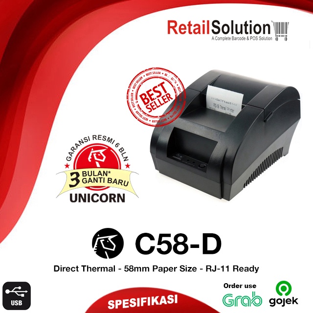 • Cetak pakai Kertas 58mm Spesifikasi : Thermal Printer Resolusi Cetak hingga 384 Dots/Garis Kecepatan Cetak hingga 90mm/Detik Manual Cutter Kapasitas Kertas hingga 65mm Koneksi : USB, RJ-11 (Untuk Cash Drawer) Power menggunakan Adaptor Dimensi Produk : 178 x127 x 105 mm Garansi Resmi selama 6-Bulan, Printhead, Adaptor tidak dicover garansi