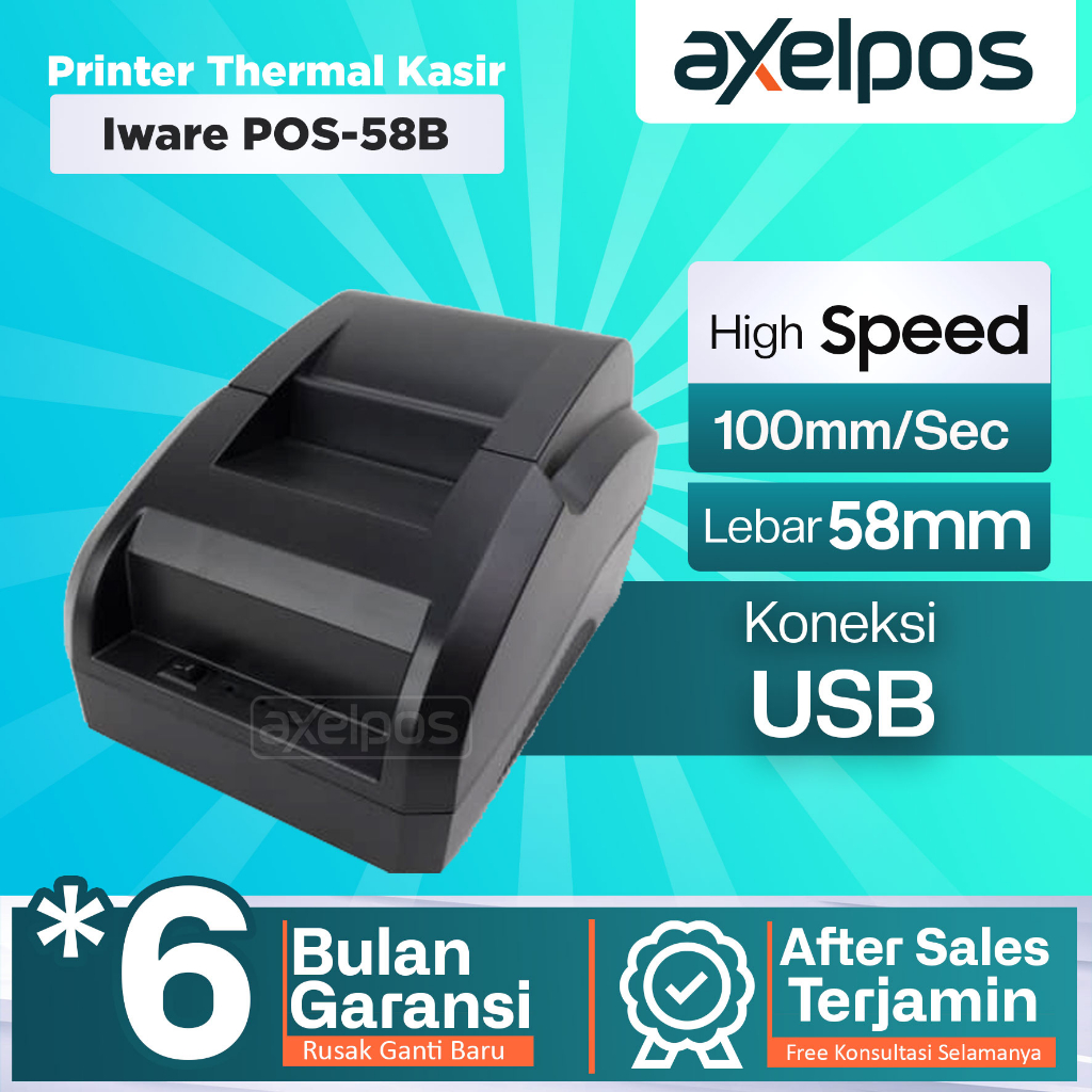 Adapun spesifikasinya : - Metode Cetak : Thermal Line Printing (system pemanasan) - Print Speed : 100 mm/detik - Interface : USB - Roll Paper : 58 mm - Dot Density : 203 Dpi, 8 Dots mm/detik - Character Size : ANK Karakter, Font A 12- 24 dots, Font B 9 - 17 dots - Command : Compatible dengan ESC/POS - Flash : FLASH 8K bytes, NV bitmap 256K bytes - Barcode 1D : UPC-A/, EAN13/8, CODE39, CODABA, CODE93, CODE128 - Barcode 2D : QR CODE - Umur Thermal Head hingga mencetak panjang 50 Km - Umur Motor : 360.000 Jam - AUTO CUTTER : NO - Warna : BLACK - GARANSI SELAMA 1 Bulan