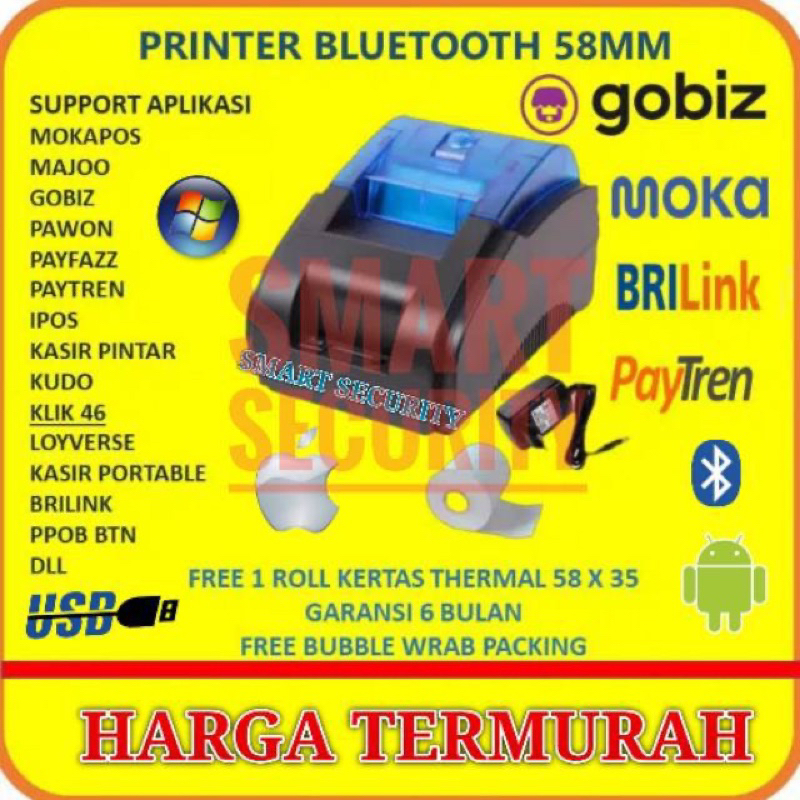 Support Android Via Bluetooth Support IPhone (IOS) Via Bluetooth Support Windows Via USB port Ada RJ 11 Untuk CASH DRAWER ( Laci Uang) Ukuran kertas 58mm Tanpa Battery
