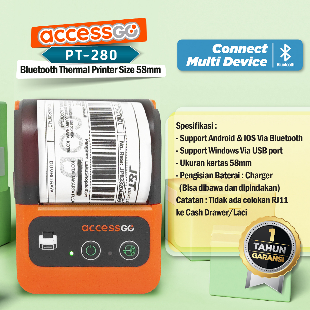isi paket : -1 Unit Printer PT280 -1 x Battery chargeble -1 x Charger -1 x USB Type C Cable -1 Roll Thermal Paper 58mm Hp Connect MPT-II via bluetooth dengan memasukkan password 0000 Aplikasi Disetting cetak ke MPT-II baru bisa cetak, masing2 aplikasi beda2 caranya