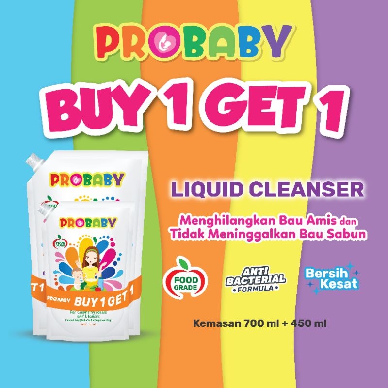PROBABY LIQUID CLEANSER Pembersih perlengkapan bayi seperti perlengkapan makan dan minum, juga buah dan sayuran, yang di formulasikan dengan Food Grade Formula, selain itu juga antibacterial, menghilangkan bau amis, busanya banyak, keset, tidak menyisakan bau pada permukaan benda yang dicuci.