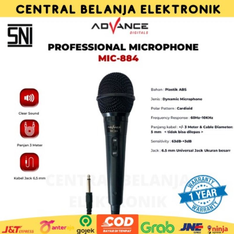 SPESIFIKASI Merk = ADVANCE Warna = Hitam bahan = plastik ABS Tipe = 884 Jenis = Dynamic Microphone Polar Pattern = Cardioid Frequency Response = 60Hz~10KHz Panjang = +/- 3 Meter/ Cable Diameter: 5 mm < tidak bisa dilepas > Sensitivity: 63dB-+3dB (0dB=1mV/pa at 1KHz) > Jack = 6.5 mm << colokan besar Mikropon Sistem Kabel Akurasi Tinggi Searah