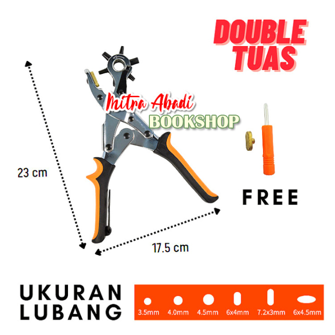 b. Varian double tuas. Netto 470 gr - mutu lebih baik drpd model lama [ merah ] dan prof single tuas - double tuas : lebih bertenaga sehingga lebih ringan saat punching - jenis lubang : 3 bulat yaitu 3.5 mm , 4.0mm , 4.5mm 3 oval yaitu 6x4mm , 7.2x3mm , 6x4.5mm