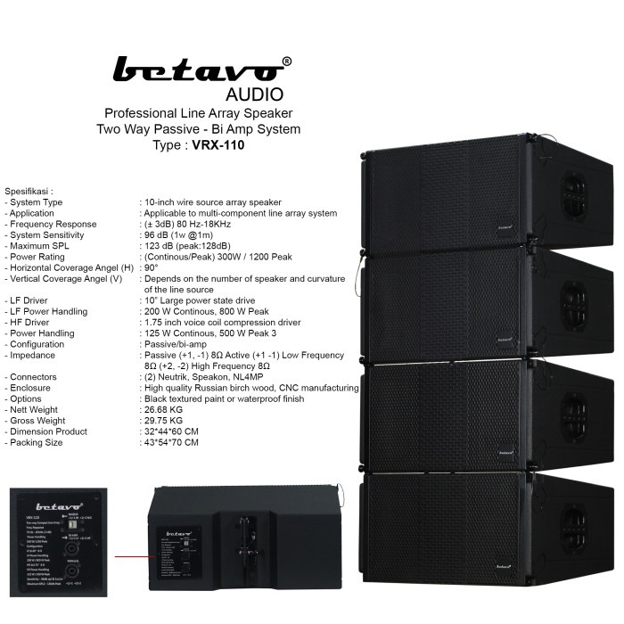 Spesifikasi : - System Type : 10-inch wire source array speaker - Application : Applicable to multi-component line array system - Frequency Response :(±3dB) 80 Hz-18KHz - System Sensitivity : 96 dB (1w @1m) - Maximum SPL : 123 dB (peak:128dB) - Power Rating : (Continous/Peak) 300W / 1200 Peak - Horizontal Coverage Angel (H) : 90° - Vertical Coverage Angel (V) : Depends on the number of speaker and curvature of the line source - LF Driver : 10" Large power state drive - LF Power Handling : 200 W Continous, 800 W Peak - HF Driver : 1.75 inch voice coil compression driver - Power Handling : 125 W Continous, 500 W Peak 3 - Configuration : Passive/bi-amp - Impedance : Passive (+1, -1) 8o Active (+1 -1) Low Frequency 80 (+2,-2) High Frequency 8 - Connectors : (2) Neutrik, Speakon, NL4MP - Enclosure : High quality Russian birch wood, CNC manufacturing - Options : Black textured paint or waterproof finish - Nett Weight : 26.68 KG - Gross Weight : 29.75 KG - Dimension Product : 32*44*60 CM - Packing Size : 43*54*70 CM