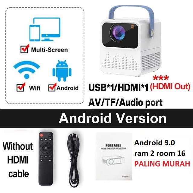 Teknologi Proyeksi 3.5"LCD Jenis Lampu LED Kecerahan (ANSI) 120ANSI Lumen Resolusi 1024*600P Kontras 1000:1, Koneksi HDMI*1 ( HDMI OUT ke TV) hanya ada pada varian ANDROID SYSTEM Koneksi HDMI *1 ( HDMI IN dari Laptop/PC/STB hanya ada pada varian BASIC SYSTEM ) Koneksi /USB*1/TF/AV/Audio(3.5mm) Umur lampu 30,000 Jam Rasio Aspek 4:3/16:9 Keystone Koreksi keystone,V+/-15° Warna Putih Hitam Jarak Proyeksi(m) 1~4m OSD Bahasa Inggri Prancis Jerman Spanyol , Italy ,China , dan lain lain Ukuran Layar Inchi 36-150 Tegangan Maksimal(V) 110V-240V(+/-10%),50-60Hz Konsumsi daya(W) 55W Wi-Fi YES Audio 1*5WSpeaker(Terminal 45W,1.25,L130) Ukuran alat 15.8x13x12(cm) Berat 0.9KG Kotak Dus ukuran 23x16x16(CM) Berat 1.38kg Aksesories standar Manaual Book, Kabel Listrik dan Remote Bidang penggunaan Home theater dan hiburan ,pendidikan anak