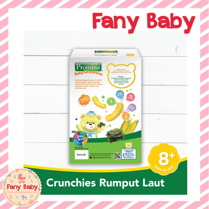 Promina Baby Crunchies Rumput Laut adalah snack crunchy dari keju dan jagung asli tanpa MSG cocok untuk bayi usia 8 bulan keatas. Promina Crunchies mudah digenggam dan Lumer dimulut sehingga membantu si Kecil belajar menggenggam dan tidak membuat tersedak.