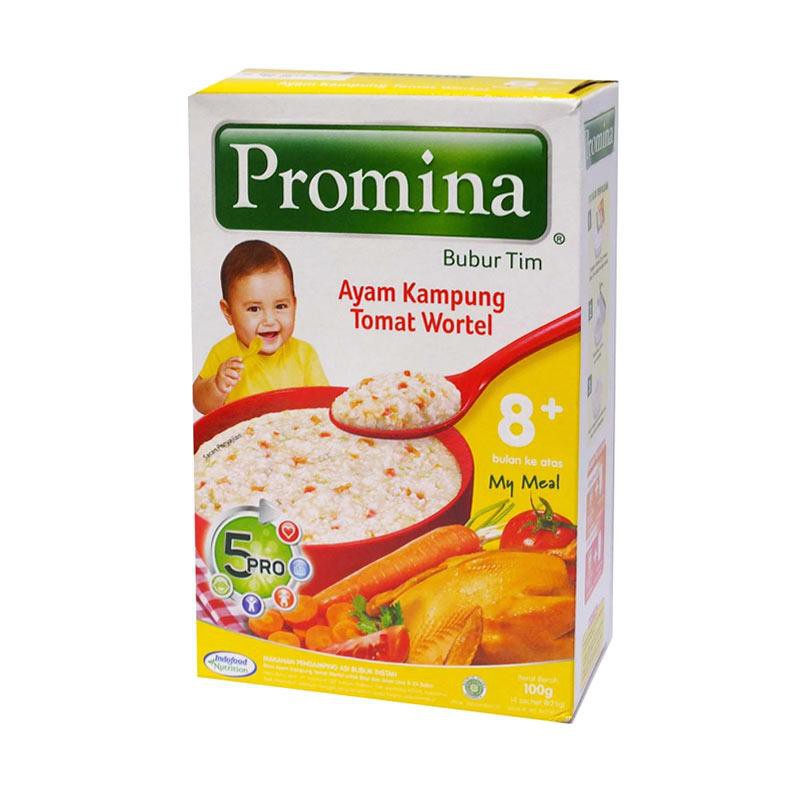 Promina BTI Makanan Bayi [Box] merupakan makanan bergizi yang sangat cocok untuk si buah hati yang terbuat dari bahan alami berkualitas yang membantu memenuhi kebutuhan pertumbuhan bayi dengan gizi yang lengkap. Promina Bubur Tim memiliki tekstur agak kasar yang dapat menstimulasi kemampuan mengunyah. Untuk anak usia 8 bulan ke atas. . . Keunggulan : - Menstimulasi pertumbuhan gigi - Melatih rasa - Umur simpan 18 bulan . CARA PENGGUNAAN : Tuangkan 1 sachet Promina bubur Tim ke dalam mangkok. Tambahkan Air masak panas 150mL. Aduk hingga rata dan siap untuk dihidangkan . TAKARAN PER KEMASAN : Sajian per kemasan : 4 . TAKARAN SAJI : Takaran saji 25g . Tersedia dalam rasa : - Daging Brokoli - Ati Ayam Kampung - Ayam Kampung Kacang Polong - Ayam Kampung Tomat Wortel - Salmon Norwegia